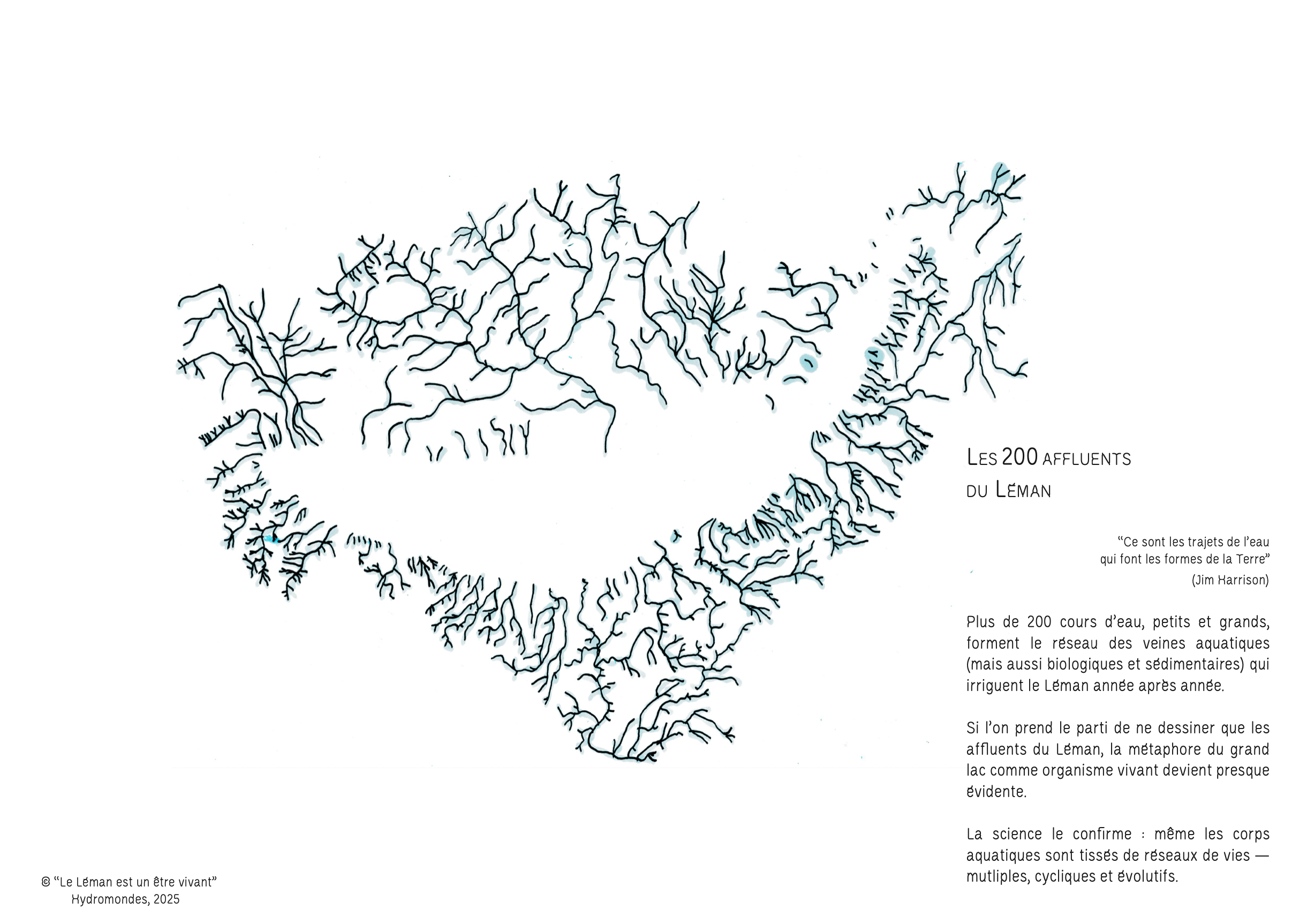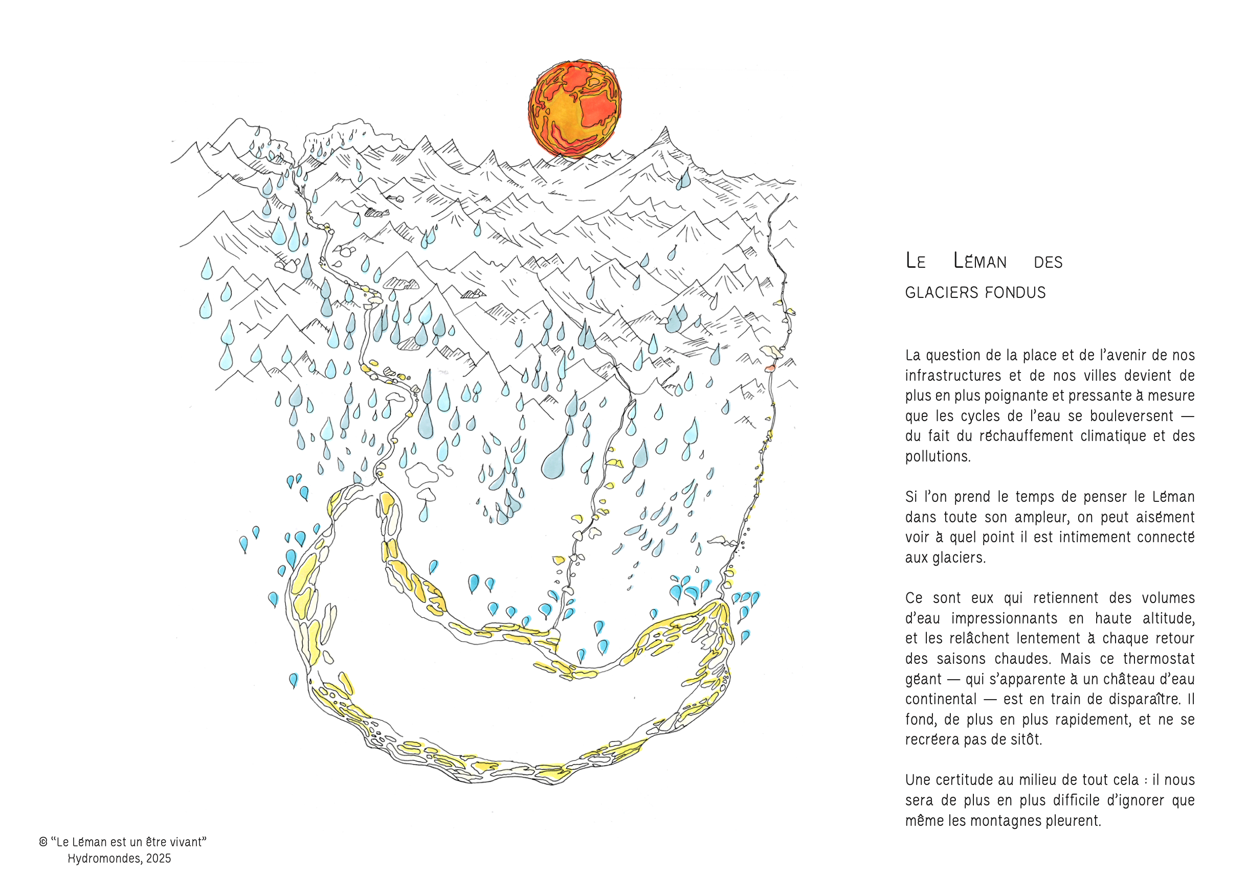 Comment le montrer avec justesse ? Lui qui est pris dans tant de grands cycles : entre Suisse et France, entre Alpes et Jura, entre glaciers du Rhône et Méditerranée, accompagné d’une myriade d’affluents – sans oublier le cortège d’être vivants, humains et autres qu’humains, qui ont vécu et vivent encore à ses côtés.