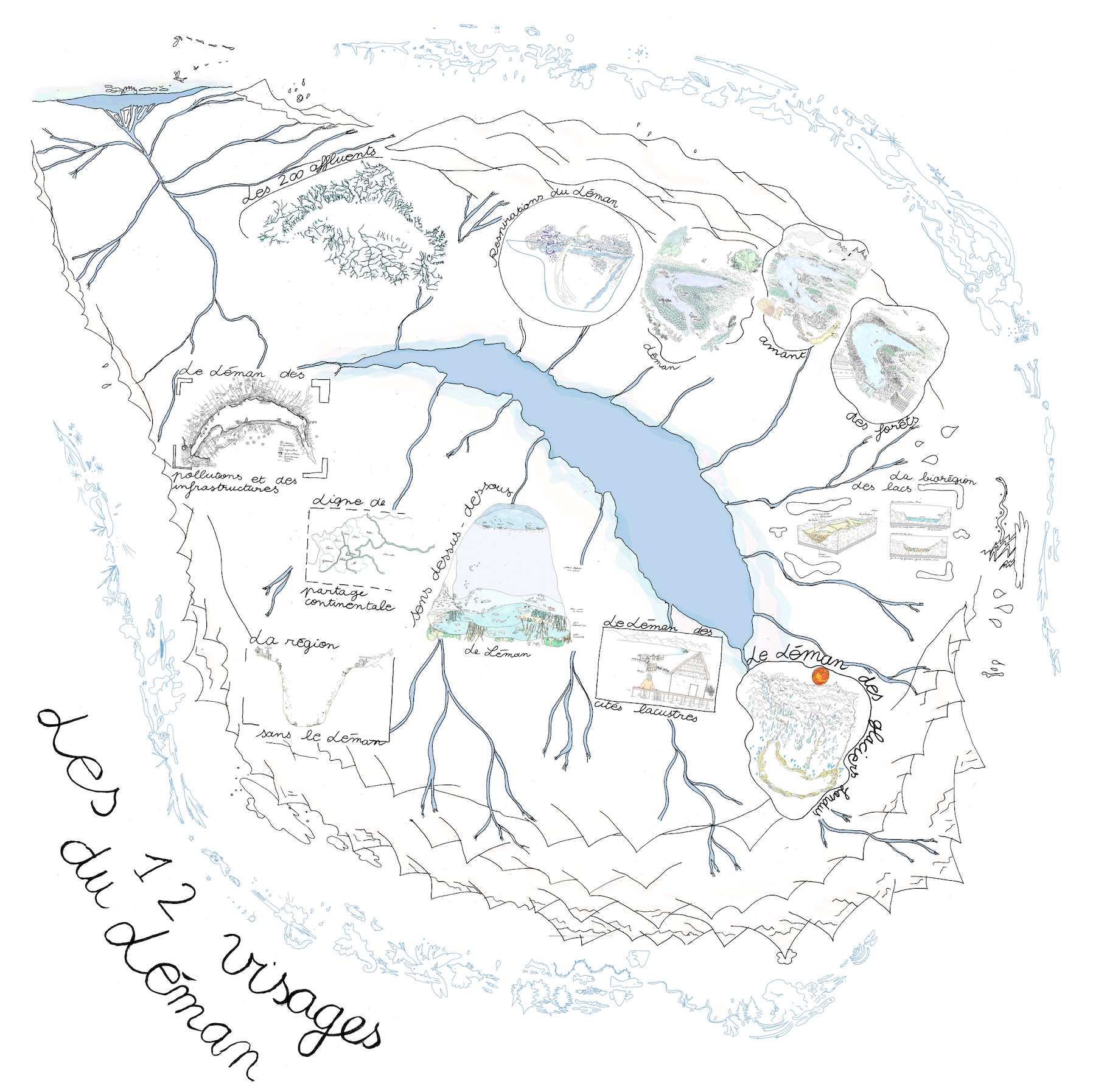 Nous avons pris le parti de le représenter sous 12 visages à la fois, comme pour capter toutes les facettes d'un grand organisme. En 12 représentations problématisées, nous avons cherché à explorer les diverses dimensions de l’identité et de la santé du Léman – depuis différents angles et depuis différentes échelles.